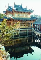 好料须用好工配。涵碧楼的斗拱结构采用了丁字牌科重昂斗六升形式辅以枫拱。该结构繁复、精良,给人富贵典雅的感觉。精美的刻梁雕栋是该楼的最出色处,梁枋上雕刻了140幅中国传统人物花卉图案。用浮雕手法雕刻的40幅人物图案是全本《西厢记》,叙事分幅明确,人物栩栩如生(图1);《百花图》雕刻有牡丹、梅花、百合、水仙、月季等一百种花卉,各呈其妍、欣欣向荣。填拱板内雕镂的是灵芝、寿字等中国传统吉祥图案(图2)。如此精美的精雕细刻,在豫园内仅此一座,故又被称为“雕花楼”。 高悬于二楼的“涵碧楼”匾额,出自当今上海年高德劭的著名书法家翁运先生的手笔,笔力遒劲,气韵生动。清代的“鸢飞鱼跃”匾,高挂于楼北。厅堂中张挂的四个清代大宫灯也是楠木制作,为华美的建筑染上了节日的喜庆气氛。