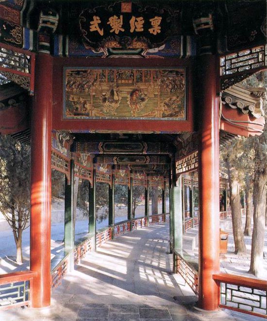 在中国古典园林建筑中,廊式建筑占有重要的位置。有游廊、曲廊、回廊、爬山廊等等。颐和园的长廊作为皇家园林中的重要景观,综合了各种廊式建筑为一体,而成为一条最长的游廊。