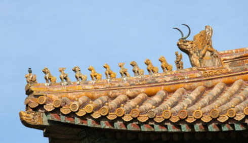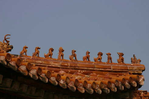中国古建筑垂脊上这些小兽的排列,有著严格的规定,按照建筑等级的高低而有数量的不同,最多的是故宫太和殿上的屋脊兽,共有10个,这在中国宫殿建筑史上是独一无二的,显示了至高无上的重要地位。