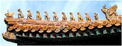 相传,明成祖朱棣修建紫禁城时,天上的玉皇大帝曾经下赐“飞禽走兽”,为人间的共主镇守紫禁城,结果紫禁城里就多了很多的小动物。现在,我们可以看到,在紫禁城建筑群的殿脊和屋脊上,有许多琉璃装饰件,主要有两类:正吻和脊兽,它们都有具体的象征意义。正吻是宫廷屋顶正脊两端的装饰件:龙头、龙口,咬往正脊,是防火镇水的象征。脊兽就是紫禁城大小宫殿的檐角上装饰的琉璃雕饰件,每一件饰物都是自古以来传说中的麟类、羽毛类和兽类的吉祥动物形象,形态各异,含义丰富,除檐角最前有琉璃“骑凤仙人”外,还有各种样式的琉璃小兽。《大清会典》上说这些琉璃釉面小兽的排列顺序为:龙、凤、狮子、天马、海马、狻猊、押鱼、獬豸、斗牛、行什。其中天马与海马、狻猊与押鱼之位可置换。如若数目达不到9个时,则依先后顺序。
