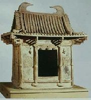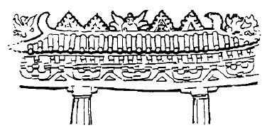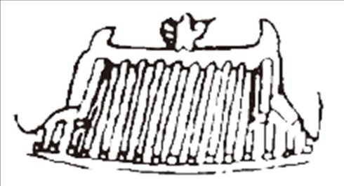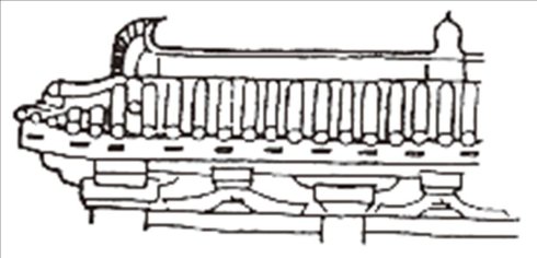 但是很可惜的是:其一,讲出此事的是后世唐人苏鹗在《苏氏演义》当中,非为事件当事人的汉人;其二,现存建筑实物中未曾发现蚩尾原型,也就无法去验证。但是值得庆幸的是,在汉代画像砖,甚至是先秦时期的绘有简单房宇图的纹饰中,都发现了正脊两端,呈上翘形的三叉构建。我们似乎可以得出这样的结论,至少在汉代以前,鸱吻的原始形象已经出现,但均处于一种初期的尝试阶段。