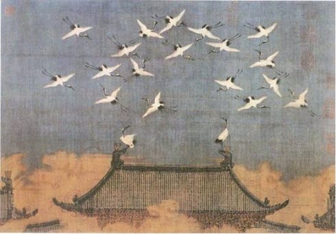 在经历了五代十国短暂纷争后,中国历史进入了宋代。每个时代都有着独有的味道和气质,并且作用在很多看得见、摸得着的方面,建筑就是一个很重要的载体。此时的建筑,少了唐代建筑的雄浑气魄,更增添了变化和绚丽,从那逐渐降低了承重角色的斗拱我们便能窥的一二。宋徽宗赵佶的《瑞鹤图》非常精细的描绘了宋代宫殿的形象,此时的鸱吻形象尾部除呼应相对外,向天际略微翘,鱼尾形象更加柔韧,富于动感,此法与北宋年间的“建筑国家标准”《营造法式》中的描述一致;另现存建筑物中山西太原的晋祠、河北正定隆兴寺等处,均能找到北宋遗韵。隆兴寺摩尼殿建于北宋皇祐四年,是我国现存唯一一座平面呈十字形的大型佛殿,非常可惜的是,这种大殿构造格局没有在后世流行,倒在日本比较多见。其正脊上的鸱吻形象,尾部卷曲,线条流畅,尤其是背部的抢铁非常显著。
