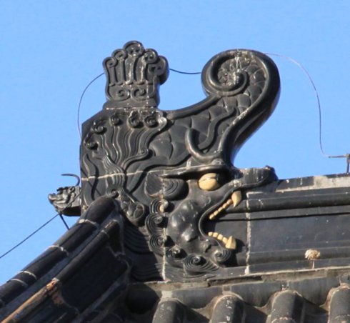 当然了,皇家的很多建筑方式在民间同样会以多种不同的样式体现出来,比如在清朝的很多名门望族家的建筑物上那各样也出现了多种类型的鸱吻形象,多以鱼的形象展示出来,在江南一些地区叫做“鳌鱼”,据明人陆容《菽园杂记》所载:“鳌鱼,其形似龙好吞火,故立于屋脊上。”据解,鳌是传说中的大龟或者大鳖,但是也有人认为应该是在南方海域偶见的鲸鱼。但不管怎么说,此时的鸱吻在民间,随着主人的身份,其上所赋予的含义也有所不同,据说大家熟悉的《乔家大院》所描述的山西巨户乔家,寓意招财进宝,且不外露,所以正脊上的鸱吻多为闭口,而同样是山西巨富的王家大院,则是张口,寓意希望家里能够有人出仕为官,为民说话,光耀门楣。有机会去山西旅行的朋友可以留意一下。