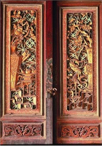 博古、花瓶:龙井林宅子孙廊上的木雕格扇门,作工极为精细,靛青色的隔心底为金钱纹及葫芦图纹,表面上是四时吉祥图,博古图架上置花瓶,插牡丹花与梅花,还有吉祥器物、书画、灯及石榴、佛手、凤梨等;中央腰华板则雕螭虎对。主题贴金箔上彩,百年后依然金碧辉煌,犹可想见当年的富丽华贵。 .出头出处:“博古图架”又称多宝格或骨董文物架,其上布置吉祥图案,如佛手、石榴的“多福多子”,灯笼是“添丁”;牡丹“富贵”,花瓶“平安”,结合为“富贵平安”,或与如意组成“平安如意”,若配合梅花、灵芝则代表“新年吉祥”;钱纹“财源广进”,葫芦“多福”,螭虎对首尾相连为“长久不断”。 .寓意:以螭虎、花瓶、牡丹、灵芝、蝙蝠等题材组合,形成多元化的祝颂意涵与暗喻,如“平安富贵”、“长寿如意”、“幸福美满”、“福禄寿喜”等。