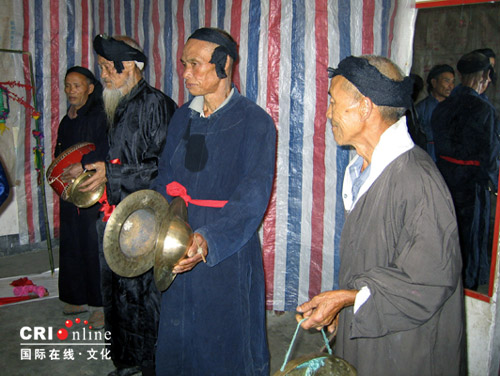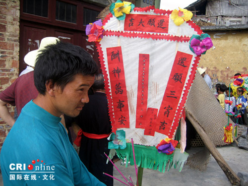 在一阵忽急忽缓的锣鼓中,掌坛师(陆德文)率灯班在陆未生家堂屋开始请神,他们神情庄重,气氛肃穆,掌坛师身着长衫,腰栓红布带,手执令牌,俨然间他已站在人与神之间的交汇点上。在这栋不大的屋子里,诸神无处不在,因为仅列在排位上的便有:天宫玉皇先师、三主宫王先师、唐王大帝、国母娘良先师、十二花园姊妹、戏耍郎君、灶王府君、屋檐童子、前传后教先师、执笔童子、捧砚郎君等等。奉请这些有位的架子神灵,主家可谓费尽心血,首先得备一头120斤以上的猪,其次是6只鸡、6只鸭,这是必备之祭品。