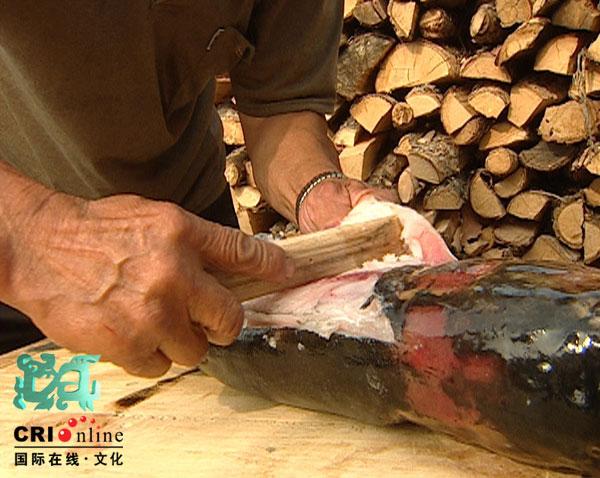 随后尤文凤用铁刀把鱼皮上残留的鱼肉一一清理干净,将鱼皮贴在门上风干,这要一夜时间才行。