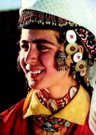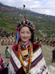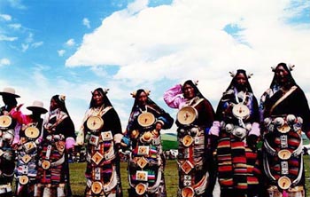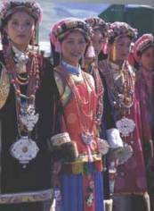 女子服饰重华丽,以各色红丝线加粗长大辫,头戴象牙、蜜蜡、珊瑚,颈部佩宝石串珠,头背札佩银制的饼铃,腰挂精巧小藏刀,加佩玲珑精致的针线盒、奶钩等吊饰,加之领袖镶饰极具民族色彩的花边图案,更具女性飘逸、秀美、潇洒的风采。