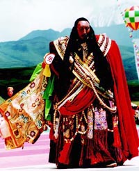 西藏高原上的藏族,或农耕,或畜牧,其长袍又别具一番特色。藏袍的材料,农民多用粗纺厚毛呢即所谓氆氇,牧民多用毛内皮外的羊皮。男藏袍大领,长袖、宽腰,左襟大,右襟小,一般在右腋下钉一个纽扣,或是用红、蓝、绿、雪青等色布做两条带子,穿时结上;多为黑白二色,直线宽边,色彩对比强烈,领围、袖口、衣襟和底边均镇色布或绸子包边,显得古朴浑厚。藏饱穿着,有两个特色:一是藏饱特长,袖筒长出手面三四寸,下摆长出脚下二三寸,穿时将藏袍顶于头上,下摆自提到膝胫之间,用长带把腰部系住,再将头从颌口钻出,胸衣下凸形成布袋,日常用品如木碗、糌粑袋、酥油盘或其他零星用品可置其中;二是常露右臂,右袖从后面拉到胸前,搭在左肩上,有时更是左右袖均不穿,两袖束于腰间,让古铜色的皮肤袒露于外,既方便工作,又显得粗犷剽悍。女式藏袍,分有袖无袖两种,夏秋即穿无袖藏袍,且里面着红、绿等色彩鲜艳的衬衣,并翻领于外。藏式女衬衣袖子特长;竟长出胳臂二三倍,平时卷挽,舞时放下,舒展间自如潇洒,有飘飘欲仙之势。