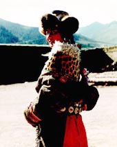 康巴特有着装,此类着装是康巴地区特有的以实用为主的服装样式,其材料多为原生兽皮板或手工家织毛织品。质地厚实,色彩简洁,款式新韵独特,具有自然、质朴、厚重的视觉效果而别具一格。
