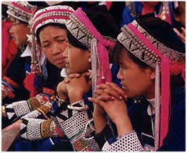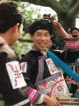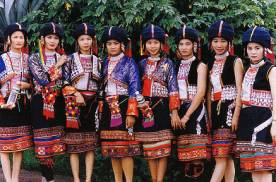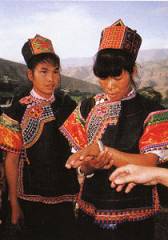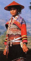 海南苗族服饰:由于海南苗族受当地黎族服饰的影响,苗女穿右偏襟长及膝部的长衫,仅一扣,无领,蜡染短裙,以黑、红色为主,花纹较少,束发,包一绣图案花纹的头巾,外面再盖一条绣有花边的尖角头帕,套上一条红带子垂在背后,显出与其他地区的苗族服饰的非常不同。