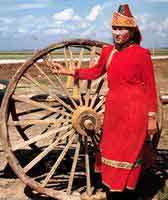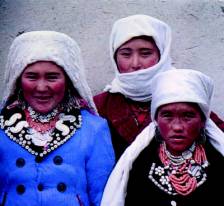 拉萨妇女的装束又有独特的风韵,她们的长袍往往用深色绸缎、哔叽、氆氇制成。夏天穿无袖长袍,里衬各种花色绸衫,腰带紧束,以衬婀娜多姿的身材。春秋穿带袖长袍,冬天则穿皮袍,长及脚裸。盛装的拉萨妇女,头戴珊瑚、松石做的头饰,名叫“巴珠”;耳带金银镶绿松石的耳坠;左手戴银镯,右手戴白海螺。白海螺从小戴在手上,据说死后可以引导人们走向幸福的彼岸。脖子上挂蜜蜡珠,胸前悬挂银盒,内装护身佛,或者种种圣物。这些装束,我们从今天节日庆典斟酒女郎的身上,仍然能够看到;藏戏和歌剧舞台上也时有出现。