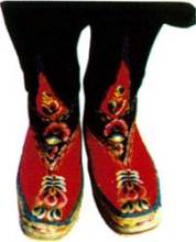 在青海乐都柳湾墓地还出土一件彩陶靴,通高1116 厘米,底长1413 厘米,陶靴内空,靴为圆形,为夹砂红陶,表面施红色,并绘黑彩,靴帮与靴底衔接处向内凹曲,靴底前尖后方,靴筒绘对称双线回纹,靴饰双线带纹和三角纹。线条流畅,纹路清晰,造型与现代藏式统靴相似,说明早在三千年前的青铜时代,青藏高原的先民已经会制作和穿用具有高原地域特征,能防寒保暖,并普遍穿用的长统靴子,并有了装饰美化的造型审美能力。