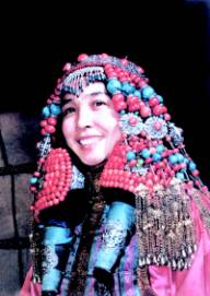 牧区妇女头饰。材质名贵,质地华丽,色彩斑澜,形式多样,有在额上或头顶处佩戴大枚琥珀或镶珠银盘,呈一点式样式。有头顶及两鬓对称佩戴嵌珠银盘,呈三角式样式。有头顶、后脑两鬓各佩戴一枚黄色琥珀或嵌珠银盘,呈梅花式样式。头饰中还有专门的以皮革或红呢制成宽长的垫带,上面缀满银泡、银盘花或黄色琥珀、红珊瑚的头饰带。这种头饰带有仅从前额经头顶、后脑及腰后戴一根头饰带的。也有再从额际两侧经双鬓、双肩于腰际戴二根头饰带,呈三根头饰带的,还有以红珊瑚珠,绿松石编串成环状帽饰的。也有以象牙、红珊瑚珠、珊瑚树、琥珀、绿松石编串成盔状帽饰的。在佩戴头饰带的同时,双鬓还悬挂红珊瑚、绿松石串珠。