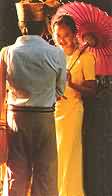 傣族妇女的这种装束,充分展示了女性的胸、腰、臀“三围”之美,加上所采用的布料经柔,色彩鲜艳明快,无论走路或做事,都给人一种婀娜多姿、潇洒飘逸的感觉。