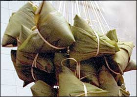 如今粽子更是千品百种,璀灿纷呈。现今各地的粽子,一般都用箬壳包糯米,但内涵花色则根据各地特产和风俗而定,著名的有桂圆粽、肉粽、水晶粽、莲蓉粽、蜜饯粽、板栗粽、辣粽、酸菜粽、火腿粽、咸蛋粽等等。