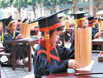 开笔破蒙的开笔礼是儒家的重要礼仪,标志着儒生幼童学习的正式开始。去年,开笔礼重现南方一些文教机构,但是礼仪并不正规,特别是给破蒙的孩子穿上了不伦不类的西方学位服。如图: 开笔礼有启蒙与激励的积极意义,是一种值得继承和发扬的传统礼仪。