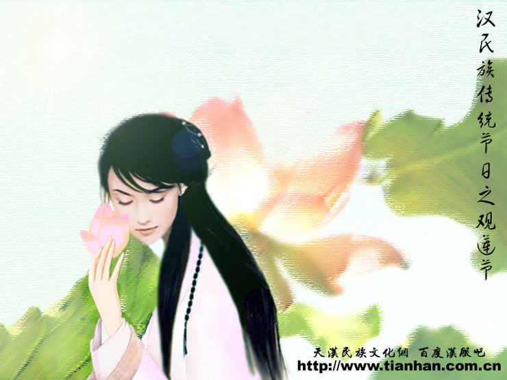 夏历每年六月二十四是观莲节(2006.07.19),民间以此日为荷诞,即荷花生日。水乡泽国的江南一带,此日是举家赏荷观莲的盛大民俗节日,泛舟赏荷,笙歌如沸,流传数代,遍染荷香,成为汉民族最优美浪漫的节日之一,观莲节。