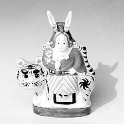 常见的“兔儿爷”,一般都是金盔金甲的武士模样。而且,插在头盔上的野鸡翎只有一根,老北京有句歇后语:“兔儿爷”的翎子——独挑。后来,“兔儿爷”又由单个武士,发展成整出武戏的“兔儿爷”,如《长坂坡》《天水关》《战马超》《叭蜡庙》等,其服装、道具,无一不和舞台上相似。再后来,又有了反映人们日常生活的“兔儿爷”,甚至,人们还把“兔奶奶”也请到了供桌上,让他们夫唱妇随,二者衣着打扮,也随时代变迁而变化。