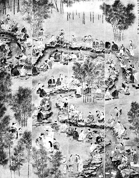 自汉代起,上巳节有了文士们水边赋诗行令、贵族官僚们河边饮酒作乐的习俗。魏晋时,经文人雅士进一步的张扬,便演化出了“曲水流觞”的逸事来。东晋永和九年(353年)三月三日,时任会稽内史、右将军的王羲之召集谢安、孙绰等名士四十一人,于会稽山之阴兰亭结伴宴饮,并引水环曲成渠,曰“曲水”,他们将盛酒的“觞”浮于水面,顺流而下,觞杯经过谁面前时,谁即可一饮而尽,然后吟诗作赋,以抒情怀。这次共得诗作三十七首,王羲之为其作序。这次祓禊宴饮,诞生了天下第一行书的《兰亭集序》,也为后世形成了一道独特的文化景观。