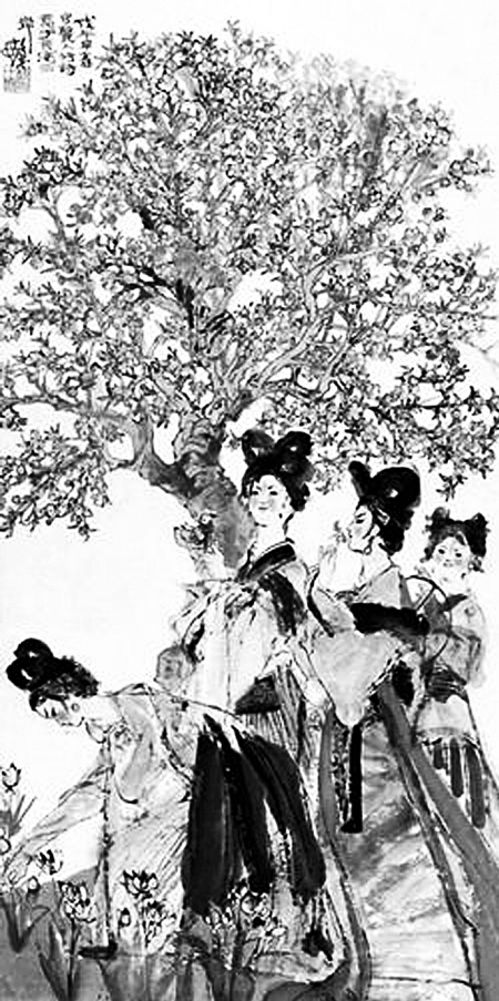 《丽人行》根据唐代大诗人杜甫同名诗而作,取“三月三日气象新,长安水边多丽人”句意。 程十发作