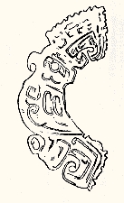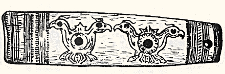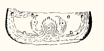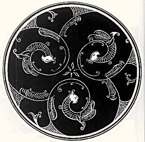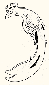 三、凤纹的艺术特征 在新石器时期,有没有凤纹样?学术界的看法至今不一致。有人认为新石器时代彩陶上的鸟纹即是凤的雏形。如浙江河姆渡文化遗址出土的一件象牙碟形器上,刻划了一组对称的鸟纹(插图一三)可认为是一对凤纹样。