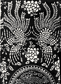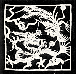 元代瓷器装饰成熟,凤纹的种种表现都富有艺术性,有些形象随手画来,浓淡得宜,明快流畅。 到了明清时期,凤纹装饰已经成为一种特定的造形,无论在圆形、方形或各种各样的装饰形体内,纹样构成都各具其内在形式,而凤纹的共性形态,也进一步规范化。其中,如明清的「团凤」图案,最是独具一格的饰模式,它与织物上的「团花」。器物上的「开圆」相配适,表现出特有的装饰风格。当年南京织造云锦的老艺人,在长期的实践设计中,总结出一套画凤口诀:「凤有三长,眼长、腿长、尾长。」,并要「首如锦鸡,头如藤云,翅如仙鹤」。这代表了明清工艺美术品上凤鸟纹样的成熟的装饰特征(插图三九)明清装饰艺术的最富有生气的作品,就是大量的民间工艺品。民间的蓝印花布、刺绣、挑花;民间木雕、石雕、砖雕和民间剪纸等作品中,形式感更加强烈,手法也更为丰富多样(插图四○、四一、四二、四三、四四、四五、四六、四七)