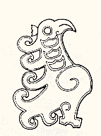 也完全表现出这样一种特征(插图二十),这时的凤纹完全是鸟类的神秘化和艺术的夸张。其中,最富有神话气氛的形象是安阳妇好墓出土的「人凤合体」玉饰(插图二一)纹样造形与其他玉凤相似,但凤头改作人头,头上置高冠,圆眼,菱形眼框,又有耳,凤体双钩冠羽纹和云纹。还有一类「龙凤合体」的玉饰(插图二二、二三)作蘑菇形羽冠,双圈圆眼,长翅举翘,足分三爪,凤体是双钩阴线翅羽纹,勾云纹。在凤背驮着一只卷状长尾