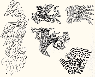 因此,难怪有人考证说:「凤这种鸟的来踪去迹。是由燕子变成了孔雀」。最能概括说明被古人神化了的凤,要算《说文·部》中的注释了:「凤,神鸟也」。「天老曰:凤之像也,鸿前后,蛇颈鱼尾,鹳鸳思,龙文龟背,燕颔鸡喙,五色备举。出于东方君子之国。翱翔四海之外……」。《说文》中所描述的这种形象,对照汉魏时期的凤纹,足证其具有代表性。