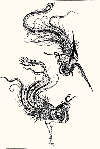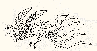的龙。龙有蘑菇形角,并刻眼目纹、重环纹、斜方格纹等。它们都典型地概括了这一时期凤纹的形式特征。关于商周青铜器上的凤纹的主要形式特征,中国考古界的具体的看法是:这些凤纹都是鸟的侧面形象,在青铜器上往往作对称式的排列。凤冠,有多齿冠、长冠和花冠三种,凡有勾喙的鸟体都可称之为凤,且绝大部分鸟喙呈闭合的弯钩形。头部的眼大多为正圆或椭圆形,凤体作鸟体或鸡体型。长短的比例常常根据装饰的部位而有不同的变化。花冠凤纹都作卷体式,凤的首尾相接,主要装饰在壶和簋一类器物上。凤纹最富有变化的是尾羽,有长尾、垂尾、分尾和对称连尾等形式。长尾凤纹的尾部最长的可达鸟体的四分之三,夸张的手法令人赞叹。长尾或凤鸟纹的尾端又有上卷和下卷的不同,它们主要流行于殷墟中期到西周中期。凤纹尾羽较宽作下垂状,称垂尾凤纹,盛行于西周中期。较晚的凤鸟纹因构图变化,使尾羽和凤体分离,即是分尾式。分尾也有上卷和下卷的不同,大多盛行于西周中期。 商周时期的凤纹,大多以雄浑、肃穆、稳健而见胜,显示了奴隶制社会的等级森严、凝重保守的风气和当时的审美情趣。战国时期是百家诸子争鸣,新经济蓬勃发展的时期,凤纹展现了新的风貌。如湖南长沙出土的「彩绘三凤漆盘」和「彩绘双凤漆盘」上的凤纹(插图二四、二五)婉曲秀丽,妩媚多姿;湖北江陵出土的龙凤九彩绣衾上的凤纹(插图二六)长冠长翼,婉转翩翻,姿态柔美动人。