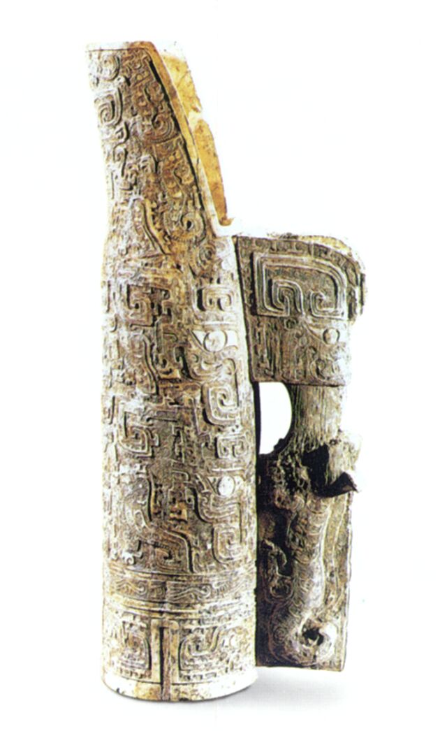 象牙觥杯1976年出土于安阳殷墟妇好墓中,是除夔龙纹象牙杯之外的又一件闻名中外的象牙酒器。米黄色,系象牙根段制成。杯身略呈圆筒形,上端有流。通体雕刻极精细的花纹,主纹浮于地纹之上,形