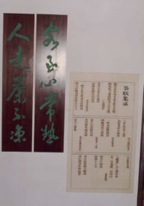 这副茶联,并无“茶”字。但一看便知,它道出了人们对茶叶的共同爱好,以及主人“以茶会友”的热切心情。使人读来,大有“此地无茶胜有茶”之感。在陈列室的门庭上,又有另一联道: