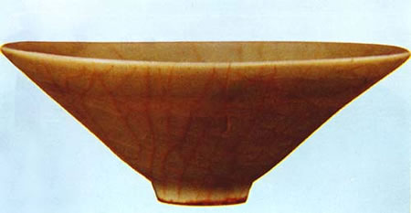宋龙泉窑青釉茶碗,形如斗笠,釉色浅青,釉层肥厚。装饰上无刻花等多余艺术处理手法,它利用釉层肥厚如玉类脂,使釉面的冰裂线纹变得特别鲜明。茶碗胎色灰白,胎体底厚壁薄。 宋代生产青釉瓷茶碗的龙泉窑窑场在今浙江龙泉金村一带。因受瓯窑影响,在质地、釉色等方面与瓯窑的产品相似。这件宋代龙泉金村产的青釉茶碗,通体施浅青釉,胎釉风格与温州西山等瓯窑的产品极其相似,很可能是温州人去龙泉定烧的瓯窑风格的青釉产品。 龙泉产的青釉瓷茶具,在宋代通过海上的丝绸、瓷器之路,大量销往国内外的很多地区。宋代,南方社会秩序安定,瓷器制品发展迅速,水路交通畅通,为瓷器生产的扩大创造了条件。宋代盛行的饮茶之风,使龙泉窑的茶具生产数量激增。从历史遗物上看,龙泉生产的饮用器具,是青瓷产品的重要品种之一。宋代龙泉窑的茶具产品,在吸收附近地区瓷窑产品特点的同时,有着自身的特色。龙泉窑不仅吸收了瓯窑的工艺技术特色,还吸收了南宋官窑先进的工艺技术特色,以及婺州窑和建窑的黑釉茶盏烧造工艺特色等。