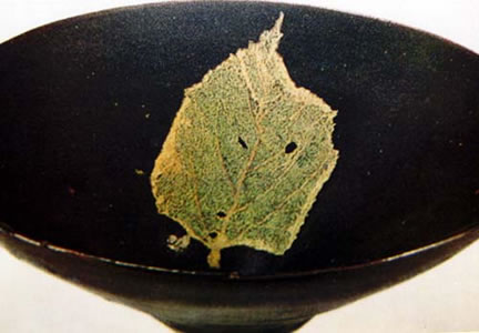 宋代在我国茶文化史上,风行“斗茶”,从宫廷到民间都喜欢用釉色深重的黑色茶碗作饮茶、斗茶器具。这件木叶纹天目茶碗,浅黑色釉地上饰以一片黄色的叶片,给茶碗增添了一份自然、纯朴的艺术美。