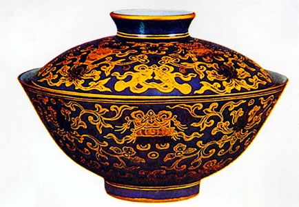 此盖茶碗的色地是霁蓝单色釉面。霁蓝是景德镇窑从元代开始成熟使用深远的釉色,釉料以氧化钴为呈色剂,含量为2%左右。清代乾隆霁蓝釉瓷是名贵的单色釉瓷器。霁蓝釉上描绘金银图案,更为珍贵。