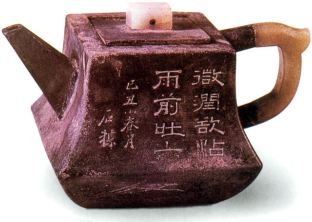 此壶1992年在南京栖霞区张化村一座清咸丰元年(1851年)的墓葬中出土。既是清代嘉庆、道光年间两位制壶大师合作的佳作,又有具体制成时间、随葬年代和出土地点的考古材料,在中国茶具史册上,它是空前的发现,堪称绝品。壶的造型出自宜兴名匠杨彭年之手。他以紫砂为坯,样子略似大钺,上方下椭,两侧又稍凹入,使得壶嘴与壶把像是从壶身里派生而出。壶身上部做出长方形平口,置长方形嵌盖,盖上饰长方形白玉穿孔纽。三者同一式样,更显得和合悦目。嵌接在壶把上的白玉半环,不仅琢得十分得体,而且与壶身镶接精致,浑成一体,毫无生造之感。出现在壶身外表的锡皮以及嵌玉装饰,是制锡名手朱坚的得手应心之作。可以看出,一层锡皮紧贴紫砂壶体,间不容发。由此可见杨彭年的用慧,似在“藏锋不露”,使人虽持此壶茗饮,但不识其容。而朱坚则在尽力“存其外形”,力求葆其原本。两位名匠的携手合作,在紫砂史册中确是罕见的。至于壶身两面的诗句和花卉,则是朱坚的设计和刀笔。一面隶书竖刻诗句八字二行:“微润欲沾,雨前吐尖。”后刻“巳丑小春月,石楳。”“雨前”即是指在谷雨前采摘的龙井茶而言,有“雨前是上品”之说。 巳丑即清道光九年(1829年)。